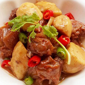 6、約40分鐘后,鴨肉已燜透了,此時(shí)把削皮切塊的芋仔放入,繼續(xù)燜至芋仔熟透。