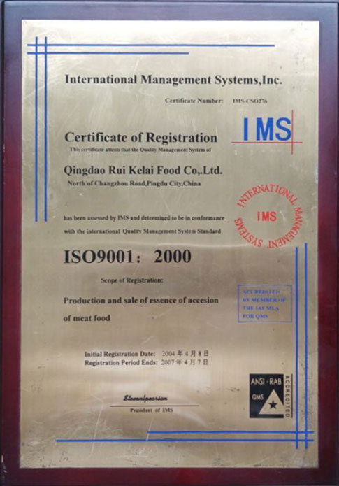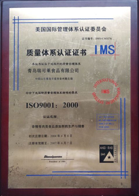 2004年04月,青島瑞可萊餐飲配料有限公司順利通過ISO9001:2000國(guó)際質(zhì)量管理體系認(rèn)證