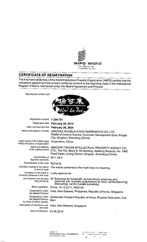 2014年5月,青島瑞可萊餐飲配料有限公司“瑞可萊”馬德里商標(biāo)國際注冊成功!