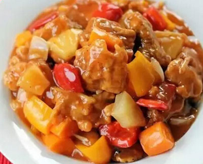 6、繼續(xù)依次炸胡蘿卜塊、菠蘿塊和洋蔥塊。