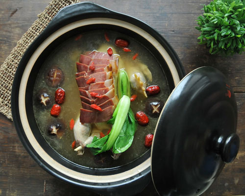 5、加入香菇,蓋上蓋子,轉小火燉90分鐘。加入紅棗再燉1小時,出鍋前加濃縮雞汁、鹽調味,撒些枸杞、青菜或蔥花裝飾即可。