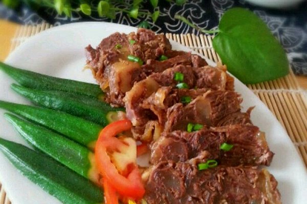 4、牛肉鹵熟后涼了切小塊用秋葵盤面點綴。