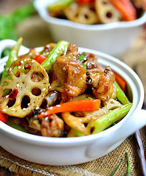 材料:小草雞半只,洋蔥半個,紅椒半個,蓮藕1節,芹菜3根,蒜5瓣,姜5片,干紅辣椒5個,香蔥2根,花椒10粒,白芝麻少許,干鍋香,料酒2勺,胡椒粉少許,生抽2勺,郫縣豆瓣2勺,白砂糖1勺,鹽適量。