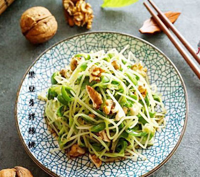 主料:黑豆芽 300克、鮮核桃 6個 調料:芝麻香精、鹽適量、黑醋少許